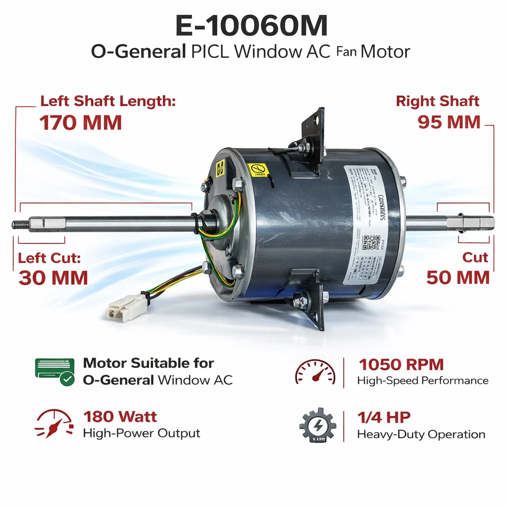 The E-10060M O-General PICL Window AC Fan Motor is a powerful, heavy-duty replacement motor engineered for O-General window air conditioning systems that demand high airflow and strong cooling performance. Designed to operate under continuous load, this motor is ideal for large-capacity window AC units used in homes, offices, shops, and commercial environments.